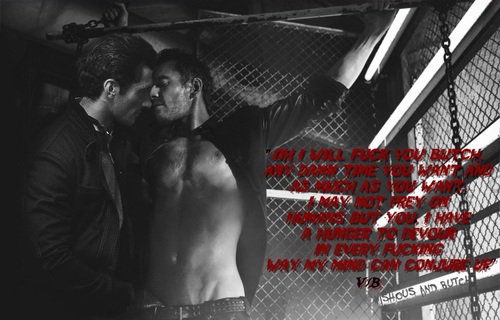 Cocking a tatted brow when you tensed up, and almost became rigid in my arms, all I could come to was yeah here was the freak out moment, the second when all this insane Vamp/Male shit came crashing down in your head. I resisted the urge to go barging and trespassing in your noggin again, some stuff was not for me to go digging around in as much as I hated the not knowing, I followed through with it. I caught some of that dancing stuff but just when I thought I could mutter a word against your skin, you went on a let’s torture the fuck out of V and started sensually moving all over me. Your chest pressing flush with mine, I could feel you’re steady if not some on the fast erratic racing of your heartbeat, that was nothing to what I felt when I ran my tongue over the strong pulsing vein that lay just under the thin barrier of flesh. Fuck, my eyes did a whole 360 back into my head when your husky heated words penetrated easily into my ear and I didn’t need any other words. Swiping the tip around right before I opened mouth, my fangs throbbing at just the thought, hell I could feel the deep rumblings in my my chest and then not to give you time to second think shit, I scraped only my canines over the vein, drawing two slight slight lines of blood and fuck me but I couldn’t hold off any longer. My upper lip pulled back and I went way the hell past being easy and dug the razor points straight through your pumping blood flow and suctioned my mouth instantly around the area. Everything in my body and mind came to the forefront in that moment, your deep rich blood came rushing out into my mouth and filled my throat up, coating it completely as I swallowed. Even my hips came up jerking off the bed, and my fingers dug into your ass, as if that hold, held me in check on this earth.